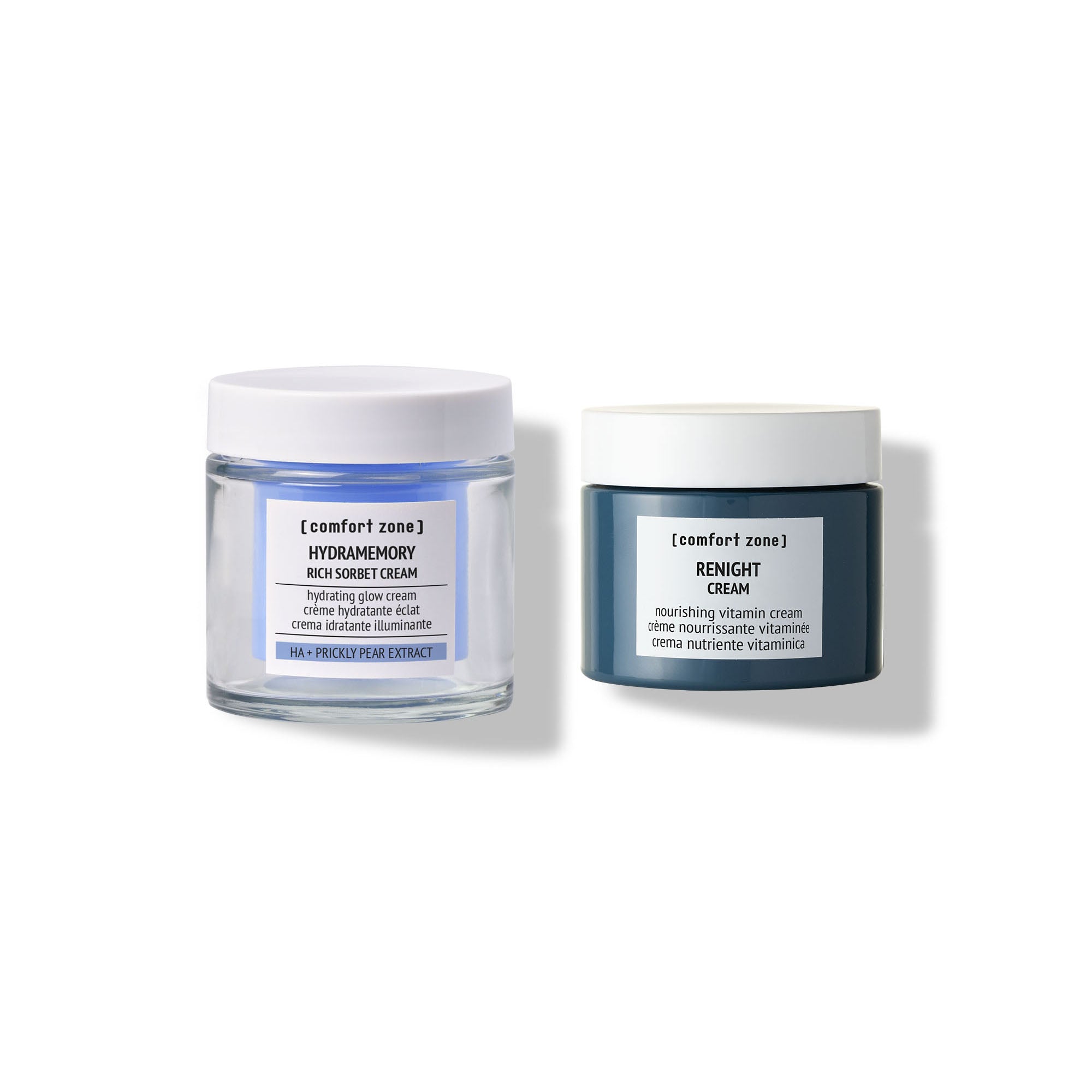 HYDRAMEMORY RICH SORBET CREAM 50ML: Aqua / Water / Eau*, Glycerin*, Butyrospermum Parkii Butter / Butyrospermum Parkii (Shea) Butter*, Propylene Glycol*, C13-15 Alkane*, Glyceryl Stearate Citrate*, C10-18 Triglycerides*, Pentylene Glycol*, Carthamus Tinctorius Oleosomes / Carthamus Tinctorius (Safflower) Oleosomes*, Behenyl Alcohol*, Betaine*, Parfum / Fragrance, Octyldodecanol*, Phenoxyethanol, Carbomer, Opuntia Ficus-Indica Stem Extract*, Mica*, Sodium Hyaluronate*, Xanthan Gum*, CI 77891 / Titanium Dioxide*, Sodium Hydroxide, Tocopherol*, Sodium Phytate*, Ethylhexylglycerin, Hydrogenated Castor Oil*, Glycine Soja Oil / Glycine Soja (Soybean) Oil*, Gluconolactone*, Sodium Benzoate, Citric Acid*, Ceratonia Siliqua Seed Extract / Ceratonia Siliqua (Carob) Seed Extract*, Potassium Sorbate*, Hexamethylindanopyran, Linalyl Acetate, Tetramethyl Acetyloctahydronaphthalenes, Geranyl Acetate, Limonene RENIGHT CREAM 60ML: AQUA / WATER / EAU*, C12-15 ALKYL BENZOATE, GLYCERIN*, CAPRYLIC/CAPRIC TRIGLYCERIDE*, ORBIGNYA OLEIFERA SEED OIL*, NEOPENTYL GLYCOL DIHEPTANOATE, GLYCERYL STEARATE CITRATE*, HEXYLDECYL LAURATE*, HEXYLDECANOL*, MACADAMIA TERNIFOLIA SEED OIL*, PROPYLHEPTYL CAPRYLATE, CETEARYL ISONONANOATE, BUTYROSPERMUM PARKII BUTTER / BUTYROSPERMUM PARKII (SHEA) BUTTER*, SODIUM ACRYLATES/BEHENETH-25 METHACRYLATE CROSSPOLYMER, HYDROGENATED POLYDECENE, SORBITAN LAURATE*, LYCIUM BARBARUM SEED OIL*, SIMMONDSIA CHINENSIS SEED OIL / SIMMONDSIA CHINENSIS (JOJOBA) SEED OIL*, TOCOPHERYL ACETATE, HYDROLYZED TOMATO SKIN*, PARFUM / FRAGRANCE, XANTHAN GUM*, CAPRYLYL GLYCOL, SODIUM ANISATE, CITRIC ACID, ACRYLATES/C10-30 ALKYL ACRYLATE CROSSPOLYMER, TOCOPHEROL, SODIUM HYALURONATE*, LAURYL GLUCOSIDE*, CAPRYLHYDROXAMIC ACID, GERANIOL, SODIUM BENZOATE