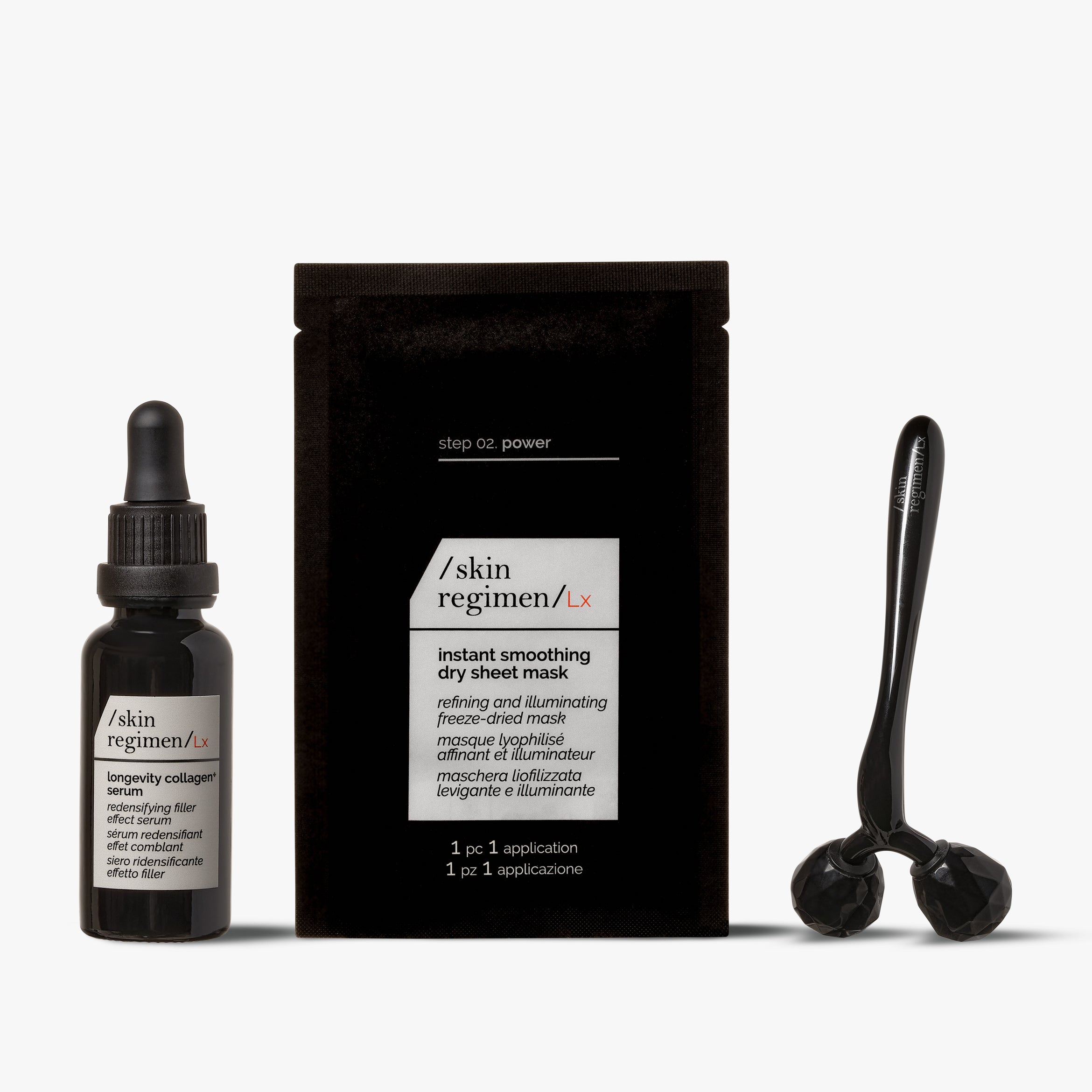 Entdecke die /skin regimen/Lx Pro-Collagen Routine – eine 3-Schritte-Behandlung für zu Hause, die Deine Haut täglich mit Kollagen versorgt.